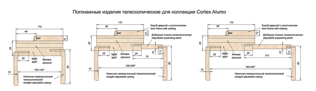 Дверне полотно Cortex Alumo з врізкою під замок і під петлі + замок в комплекті. Спеціальний профіль короба дозволяє встановлювати лиштви практично в одній площині з полотном, що відповідає сучасним тенденціям. Торець полотна облицьований алюмінієвої кромкою, яка, крім декоративної функції, захищає двері від механічних пошкоджень. Регульовані 3D-петлі, що входять в комплект дверного короба, дозволяють точно відрегулювати положення дверного полотна. Використовується ущільнювач DEVENTER 3967, який володіє поліпшеними експлуатаційними характеристиками, зручний при монтажі дверного блоку (капелюшок шурупа, яким кріпиться короб, ховається під ущільнювачем). Дверне полотно комплектується замком AGB (при необхідності є можливість встановити сантехнічний фіксатор). Дверний короб розрахований на товщину стіни 100-120 мм (для більшої товщини необхідно застосовувати добірну планку або розпускати наличник). Дверний короб зарізаний під 45°, просвердлені отвори під шканты. Це дозволяє позбутися від щілин на стиках між довгими і короткими наличниками